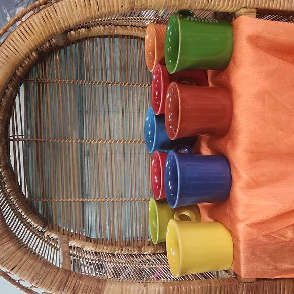 7 different Fiesta Mugs. 1 Daffodil mug, 1 Shamrock mug, 1 Chartreuse mug, 1 Lapis blue mug, 1 Peacock blue mug, 1 Paprika mug, and 1 Tangerine mug. All are in great condition. Mix and match. Each mug is $10.