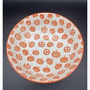 MugShotz Stoneware Orange White PUMPKIN Jack O Lantern Footed Serving Bowl 10”