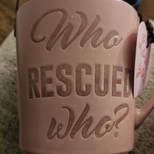 says "Who Rescued Who?" on both sides of mug
