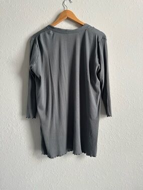 Light ribbed knit robe-style cardigan. Open front with relaxed drape. Three-quarter sleeves and subtle lettuce hems. Versatile layer for lounge or casual wear.