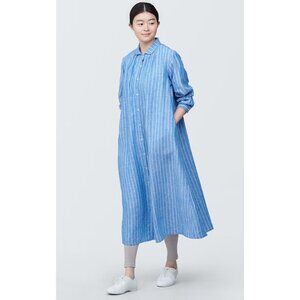 Muji Womens Blue Striped 100% Linen Long Shirt Dress M-L Made In Cambodia