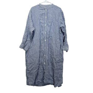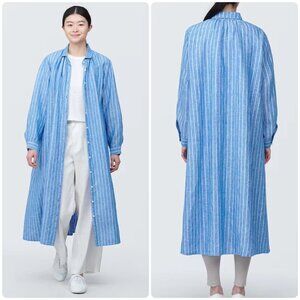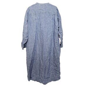 Muji Striped 100% Linen Long Shirt Dress Tunic Women M-L Blue Nautical Lagenlook