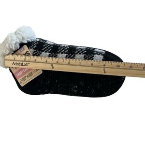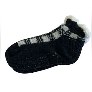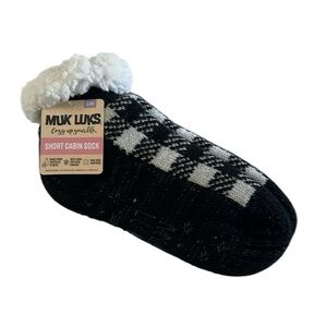 Cozy black and white short cabin sock by Muk Luks. Perfect for warmth and comfort.