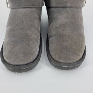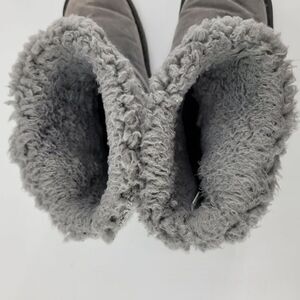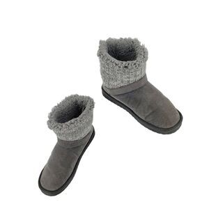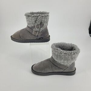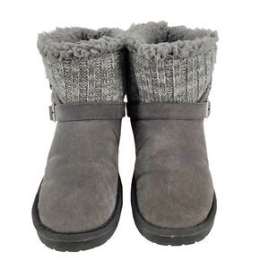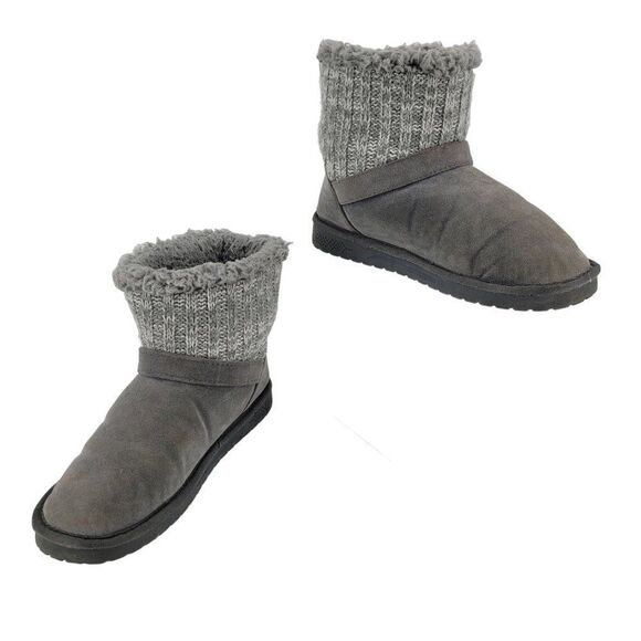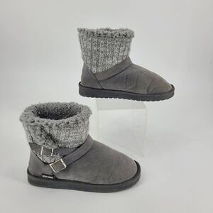 Muk Luks Boots 8 Gray Short Rib Knit Double Buckle Vegan Faux Suede Pull On