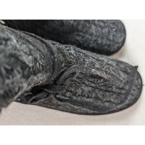 These Muk Luks women's black knit boots are cozy and stylish, perfect for keeping warm during the colder months. They feature a soft, textured knit upper with faux fur lining and trim for added comfort. The boots have lace-up detailing for an adjustable fit and durable rubber soles with a unique tread pattern. The overall condition shows minor signs of wear, making them ideal for both indoor and outdoor use.