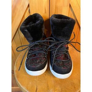 Muk Luks Colleen Black Boot 9 laces up and around boot fold over faux fur cuff knit design on toes has a mark on front cuff see picture