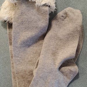 The perfect soft grey boot sock with a fuzzy white top. These are new and never worn and are still attached at the toe with the manufacture thread. They measure toe to top 25 inches with nice stretch.
