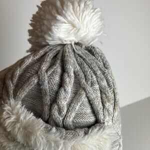 Gently Used Muk Luks Beanie Hat. Gray with cabling pattern and white faux fur lining, poof, and front accents. The faux fur inside is so soft and warm! Exterior is 100% acrylic, interior is 100% polyester.