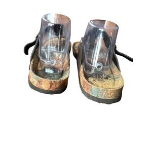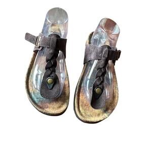 Muk luks women's size 10 Thongs, Mocha brown leather/suede. Features an adjustable strap with braid detail from toe to strap. * See last photo..there is a 1/4" gap in the cork-like trim. It is glued well, but that piece is not there. Doesn't affect wear-ability.