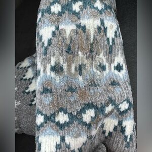 Warm knit slipper socks with a gray and white pattern. Perfect for lounging.