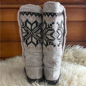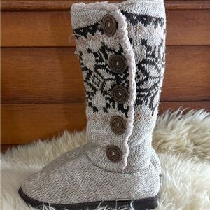 Muk Luks Tan/ Brown Cozy Knit Button Fleece Lined Rubber Sole Slippers Boots