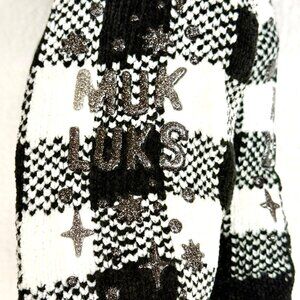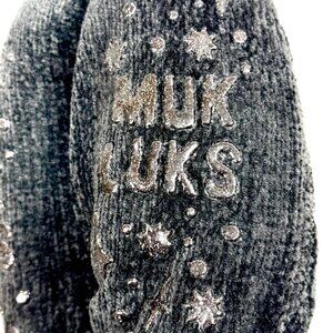 These Muk Luks Women's Cabin Socks provide warmth with their full lining and ensure safety with their non-skid bottoms. For indoor wear only. Two pair pack as seen in the photos. Dark black and white/black plaid. Both have glitter non skid details on the soles.