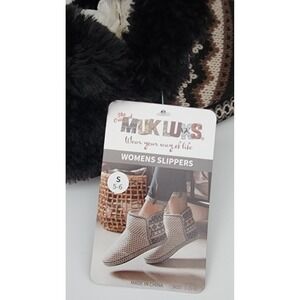 Keywords: Muk Luks slippers, womens slippers, knit slippers, faux fur slippers, booties, indoor shoes, cozy slippers, house shoes, womens footwear, neutral slippers, ebony slippers, small slippers, winter slippers, warm slippers, gift for her