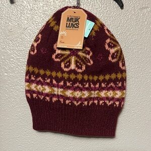 MUK LUKS reversible hat and scarf set, featuring a Fair Isle pattern in shades of burgundy, pink, and gold. MUK LUKS is known for its cozy and stylish cold-weather accessories, including slippers, boots, and various knitwear items.