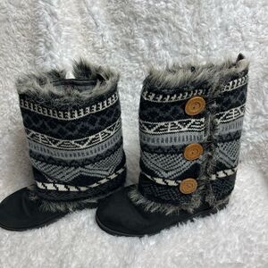Muk Luks Winter Boots reversal Blk faux suede,navy blue knit & gray faux fur SZ8 side zipper pre owned in good used condition signs on wear on the outer soles see all pictures any questions please message.