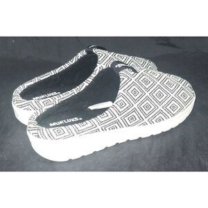 Size 7/8 black cream diamond pattern. MUK LUKS Women's Hailey Clog Slippers have a 3-layer support foam insole cushions every step. Designed with built-in metatarsal, arch, and heel support, the Clog Slippers offer comprehensive foot support with the added convenience of an indoor/outdoor outsole. Wipe with damp cloth, do not bleach, dry flat