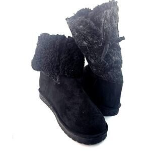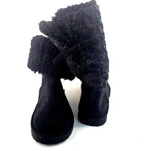 Mukluks Cozy women's size 9 winter fur boots, polyester suede, lined black slipper boots, tie closure, winter, fall, fold down, round toe, pull on, casual, flat, knit, bow, rubber soul, mid-calf.