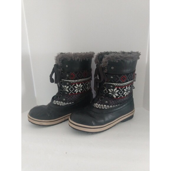Mukluks Women's Black Winter Boots Lace Up Aztec Geometric Print Faux Fur Size 8. Water Resistant rubber soles, Thinsulate Insulation lined 200g.
