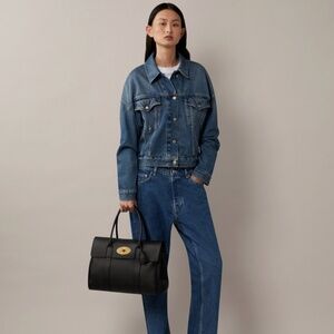 Sleek black leather tote by Mulberry. Features gold hardware. Ideal for versatile style.