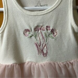 Sweet dress by Milkberry. Top is a soft tank style and features embroidery of ballet shoes and flowers. This one piece outfit/dress snaps between the legs. Tutu like skirt covers the snapped area. Dress is a size 6-9 months and is in “like new” pre/owned condition.
