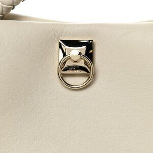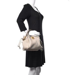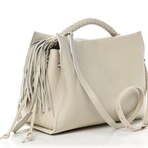 This stylish satchel is crafted from luxurious leather in Chalk (taupe white). The bag features braided leather top handles with leather fringe and gold links, an optional shoulder/cross-body strap, and gold hardware (note that lighting can make it appear silver, but it is actually gold). The flip-top opens to reveal a beautiful taupe suede interior. This has room for all your daily necessities, featuring the classic style only from Mulberry.