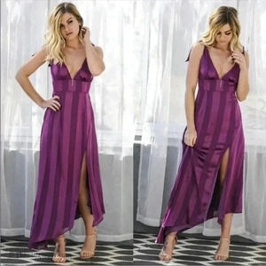 Mulberry Maxi Asymmetric Dress is new with tags. Includes a plunging neckline, ties on shoulders, an asymmetrical hem, a side slit, a hidden zipper and eyelet closure. 100% polyester.