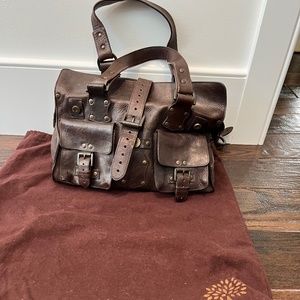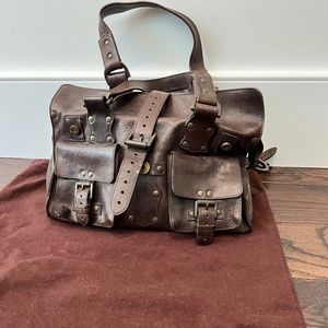 Mulberry Leather Purse, vintage quality, excellent condition. Has two outside pockets and a snap closure. Inside has a zipper pocket. Dark brown leather with metal hardware.