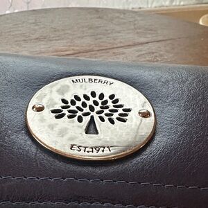 Chic royal blue leather clutch with signature Mulberry emblem. Compact and stylish.