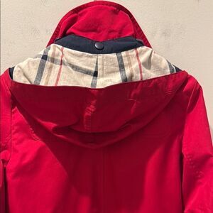 Stylish red jacket with navy accents. Features a zip-up front and pockets. Perfect for casual wear.