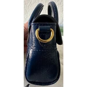 Rectangular shape, double top handles, cross-body strap, flap front, engraved branding at plaque, gold-toned hardware, one main compartment, internal pocket