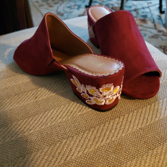 Restricted burgundy colored Embroider mules