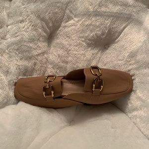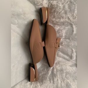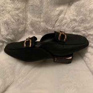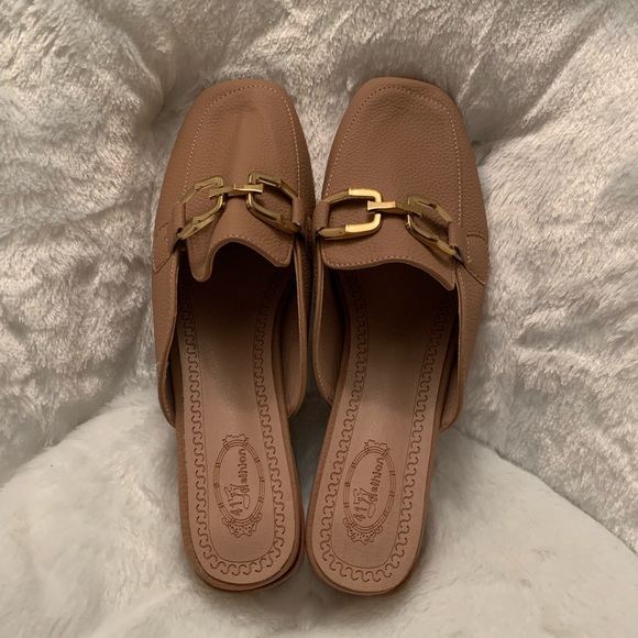 Never before worn mules. I have a green, tan, and black pair with a gold accent buckle. There’s also a gold strip around the heel. They are a size 41 which is equivalent to US 9. Dress them up or dress them down. Would make a great addition to your fall wardrobe.