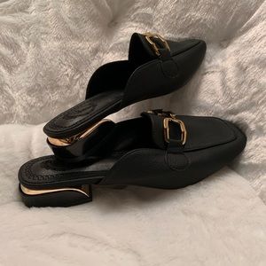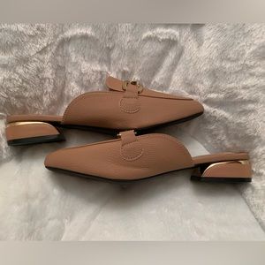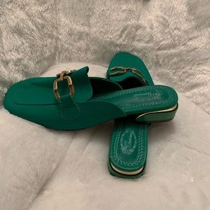 Never before worn mules. I have a green, tan, and black pair with a gold accent buckle. There’s also a gold strip around the heel. They are a size 41 which is equivalent to US 9. Dress them up or dress them down. Would make a great addition to your fall wardrobe.