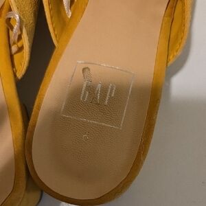 GAP backless suede mules in a warm yellow hue. Padded footbed for comfort. Slip-on style with a rounded toe. Simple, versatile design for daily wear.