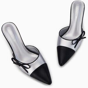 Mules Heels Silver Faux Leather Closed Pointed Toe Slip On Backless Shoes Pumps