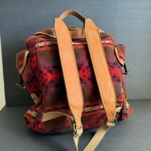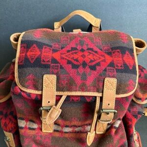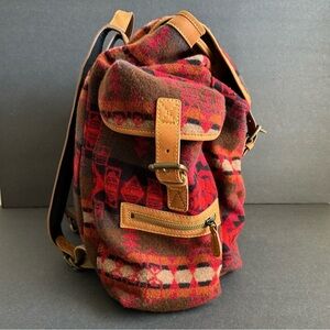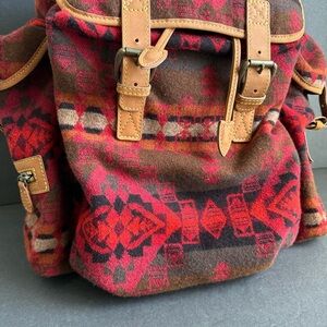 Mulholland Brothers Backpack Red Aztec Navajo Print Wool Brown Leather Rucksack