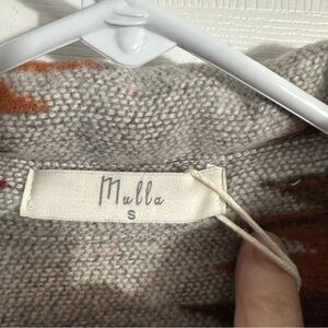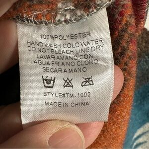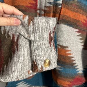 Size small Aztec print "Jackson" shacket by Mulla. All over print, hi-low raw edge hem, blue/white/rust. 100% polyester. Button front.