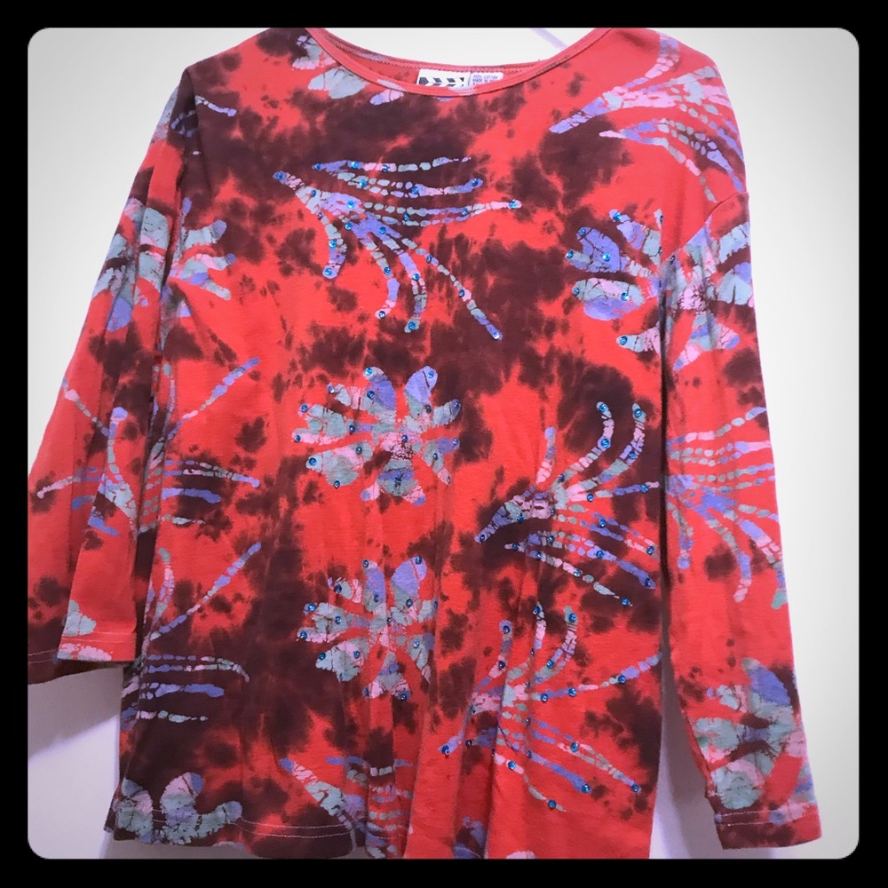 TOP 100% cotton, 3/4 sleeves by Take Two. Red with black, green, and blue design, blue sequins