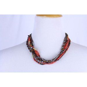 Multi 6 Strand Brown Orange Wood Bead Unisex Hipster Necklace 19" Button Close