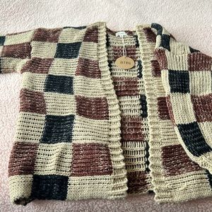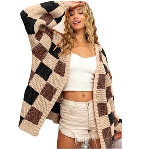 Multi Brown Black Checkered Open Front Cardigan Sweater NWT - (#0106)