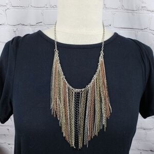 Chunky multi chain multi metal finishes fringe necklace, double lobster clasp closure.