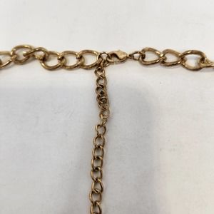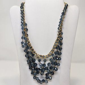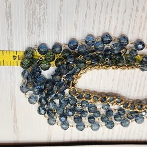 Multi chain layered faceted blue bead gold tone chain necklace collar, lobster clasp closure with extender chain. Costume Fashion Jewelry Statement Chunky