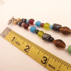 Various sizes and colors of glass beads. Silver tone toggle clasp. Please see all photos. Roughly 18 inches long.