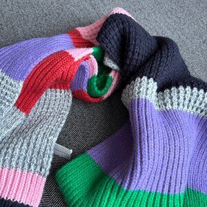Featuring color block stripes of various widths, knitted in green, purple, gray, red, pink and navy colors.