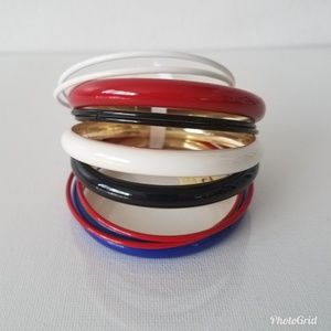 Stack of red, blue, black and white bracelets. Can be worn as a whole or individually. 10 individual bracelets in a set. Have three separate sets. Circumference is 2 3/4.