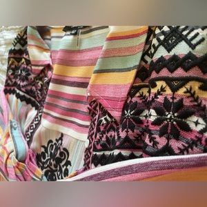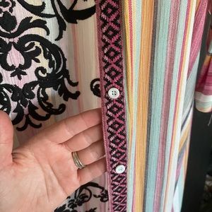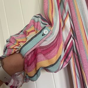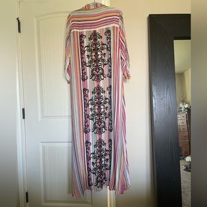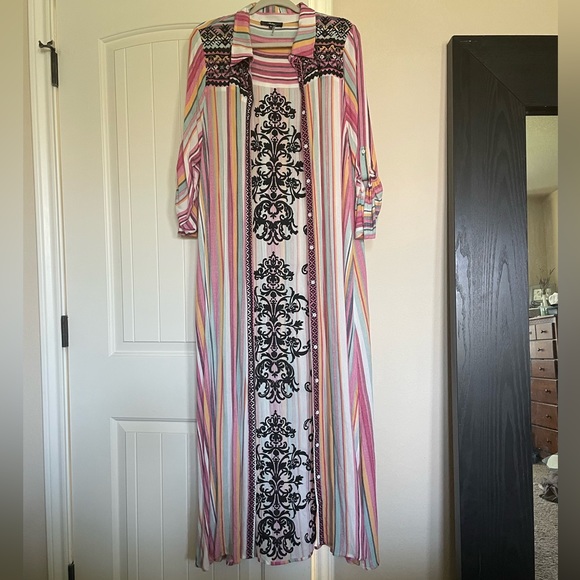 This beautiful multi colored button up can be worn many different ways! Button it all the way up and wear as a dress. Keep it unbuttoned and put it over Jean shorts and a white tank! The detail is absolutely beautiful! Best of all.. it has POCKETS! It is very long. For reference I am 5’6 and it touch’s the floor bare foot! Through on some wedges or summer heels or let it glide on the floor!! 🤍💜🩵🩷💛 I’ve sadly never got to wear this before I lost some weight! It is in like new in GREAT condition!