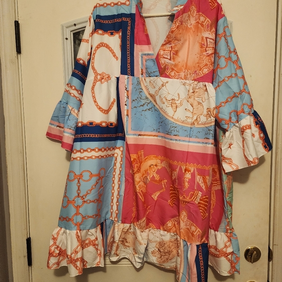 Multi Color pullover loose dress with a v-neck and ruffle around the sleeve and bottom trim.
