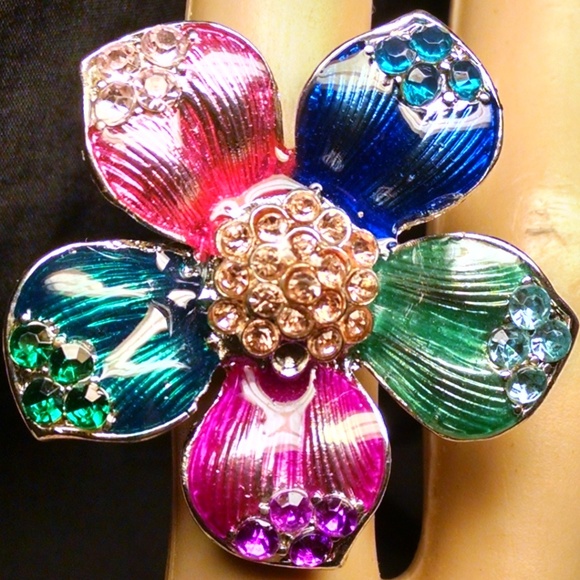 Beautifully Designed Gorgeous Gorgeous Elegant Multi Color Flower Rhinestones Sexy Stylish Fashion Large Cocktail Evening Gala Prom Ring Size 6.5. It will be great for just about any fancy special occasion. This ring is so gorgeous, the pictures does not do it justice. It looks way better in person. It is a must have. It is a solid well made ring. Will come in a beautiful gift bag or box. It is 1 1/2" longest area.