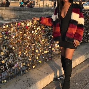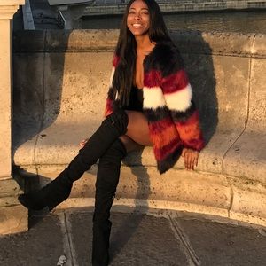 Red, orange, white, black stripped fur jacket