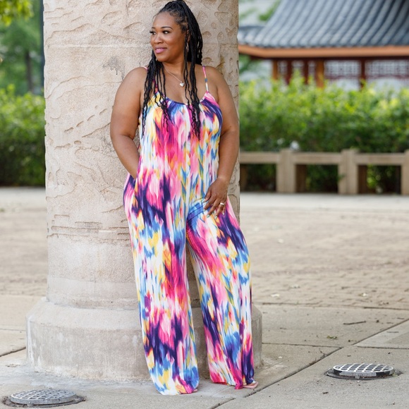 This tye-dye jumper will have you daydreaming about palm trees, cool ocean breezes, and boardwalk strolls! Its sexy spaghetti straps are adjustable and Its lightweight, flowy material is soft on the skin. The wide-legged style is perfect for sandals or heels, depending on the occasion.